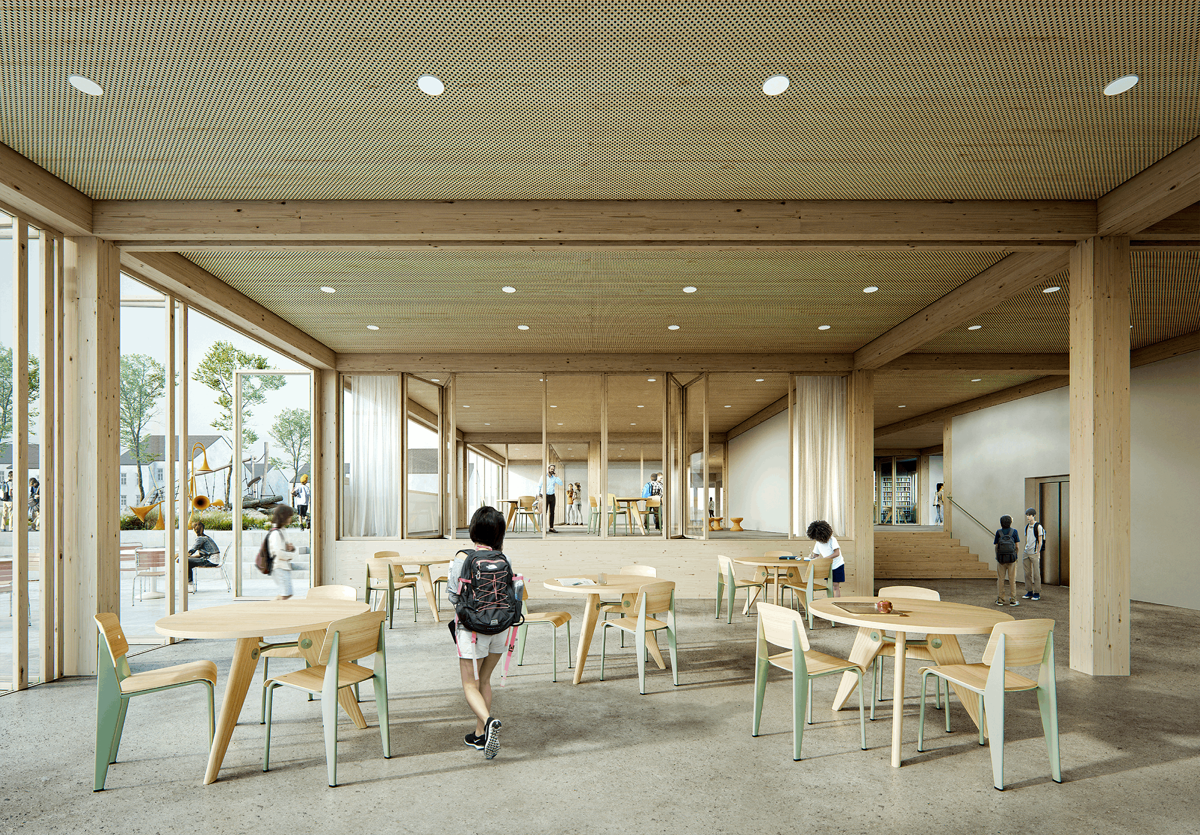 Der Entwurf für das neue Grundschulgebäude entwickelt eine klare architektonische Struktur, die sich sensibel aus der vorhandenen städtebaulichen Körnung ableitet und diese zeitgemäß weiterdenkt. Die Organisation des Baukörpers folgt dem Prinzip einer modularen, hochflexiblen Grundrissanordnung, die unterschiedliche pädagogische Konzepte unterstützt und zukünftige Anpassungen problemlos ermöglicht.